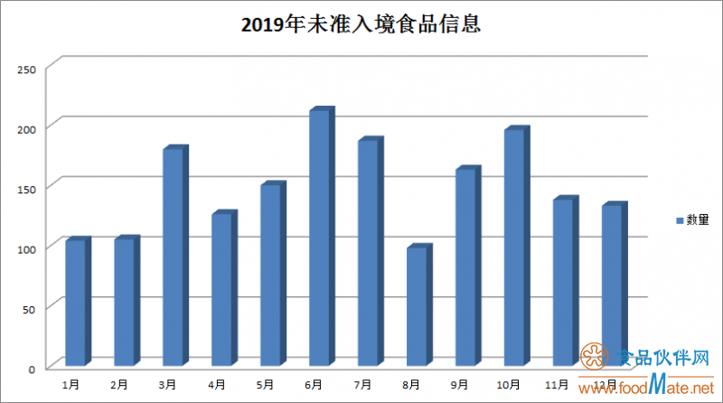 按月統(tǒng)計發(fā)現(xiàn),6月、10月、7月、3月未準入境食品數(shù)量居多,分別有212批次、196批次、187批次、180批次。具體每月未準入境食品數(shù)量見下圖: