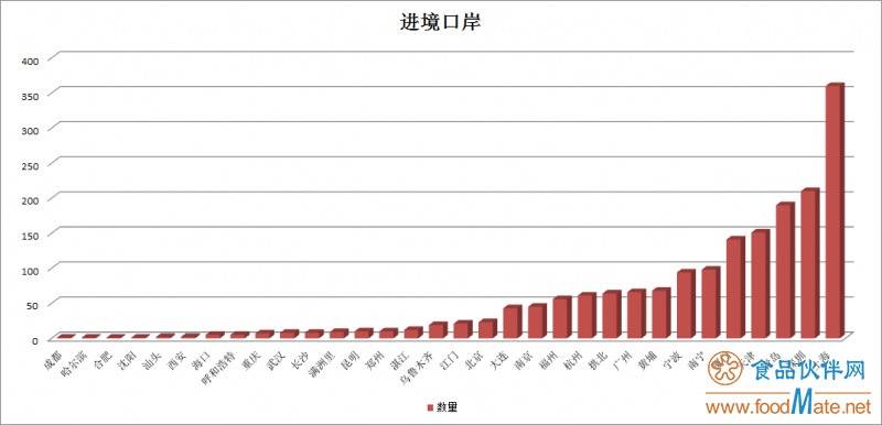 據(jù)統(tǒng)計,這些未準入境食品進境口岸涉及上海、深圳、青島、天津、廈門、南寧、寧波、黃埔、廣州、拱北、杭州、福州、南京、大連、北京等30多個城市。各口岸未準入境食品數(shù)量如下圖。